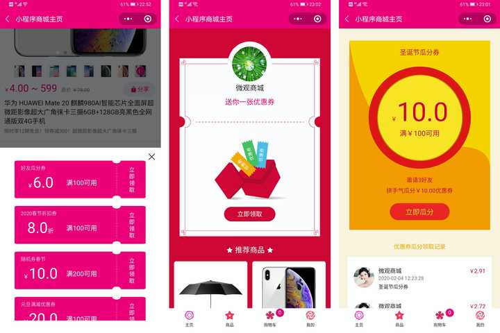 微商城做的不錯,餐飲小程序可以很好的實(shí)現(xiàn)。這里說一下微商城的營銷功能。因?yàn)闋I銷功能太多,不能一一解釋。主要說如何使用小程序的優(yōu)惠券功能。優(yōu)惠券營銷簡單直接,吸引新客戶,長期鎖定客戶都很有用。