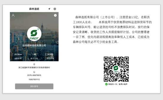 4.1-森林造紙廢紙排隊小程序,可以減少排隊時間,提高效率,降低人工成本,對于這個企業的送貨司機、門衛、管理者來說非常實用。